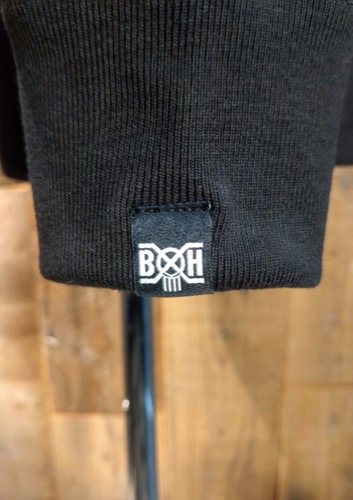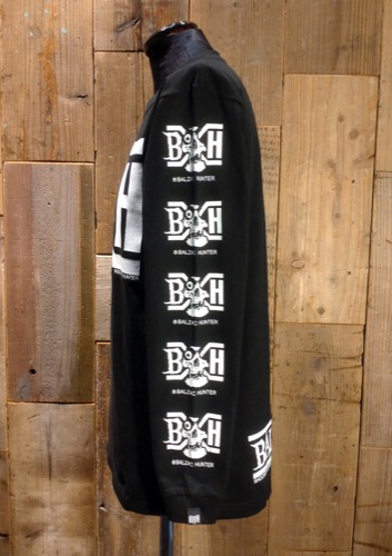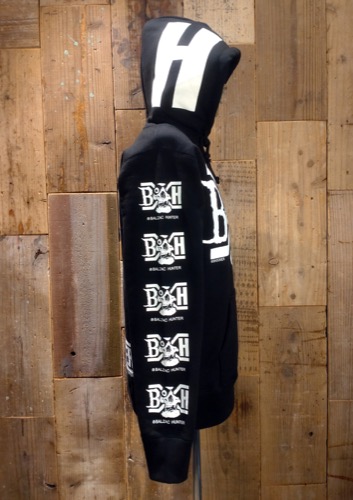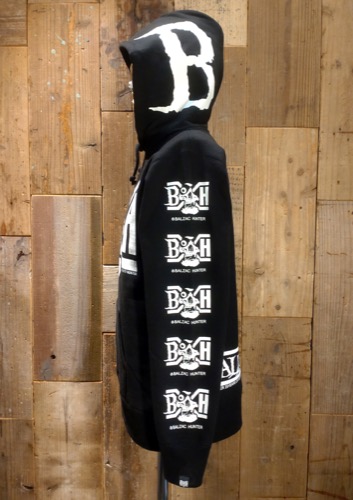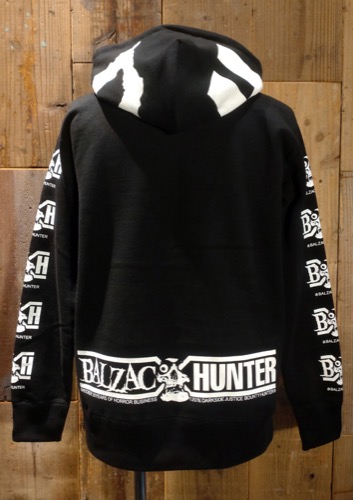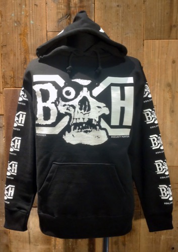 プルフーディーは、フード両側にBとHのロゴ文字をそれぞれプリント、両袖に5連柄のBALZAC HUNTER SKULLのロゴを配するという、ボディ各所にプリントを満載した決定的な1枚が完成!12.4オンスのスーパー・ヘビーウェイトの裏起毛ボディを使用した極厚手重量フーディーで登場。